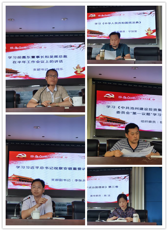 會議首先由宣傳委員領學《習近平談治國理政》第三卷中《全面把握中國特色社會主義進入新時代的新要求》《全面貫徹新時代中國特色社會主義思想和基本方略》《新時代要有新氣象,更要有新作為》等重點篇目。隨后,各支委分別帶領大家學習《民法典》、習近平總書記視察安徽重要講話精神、吳躍勤同志先進事跡,并傳達了《中共池州建設投資集團有限公司委員會“第一議題”學習制度》《池州市市屬企業違規經營投資責任追究實施辦法(試行)》以及胡嘉東董事長和吳暉總裁在半年工作會議上的講話精神等。
