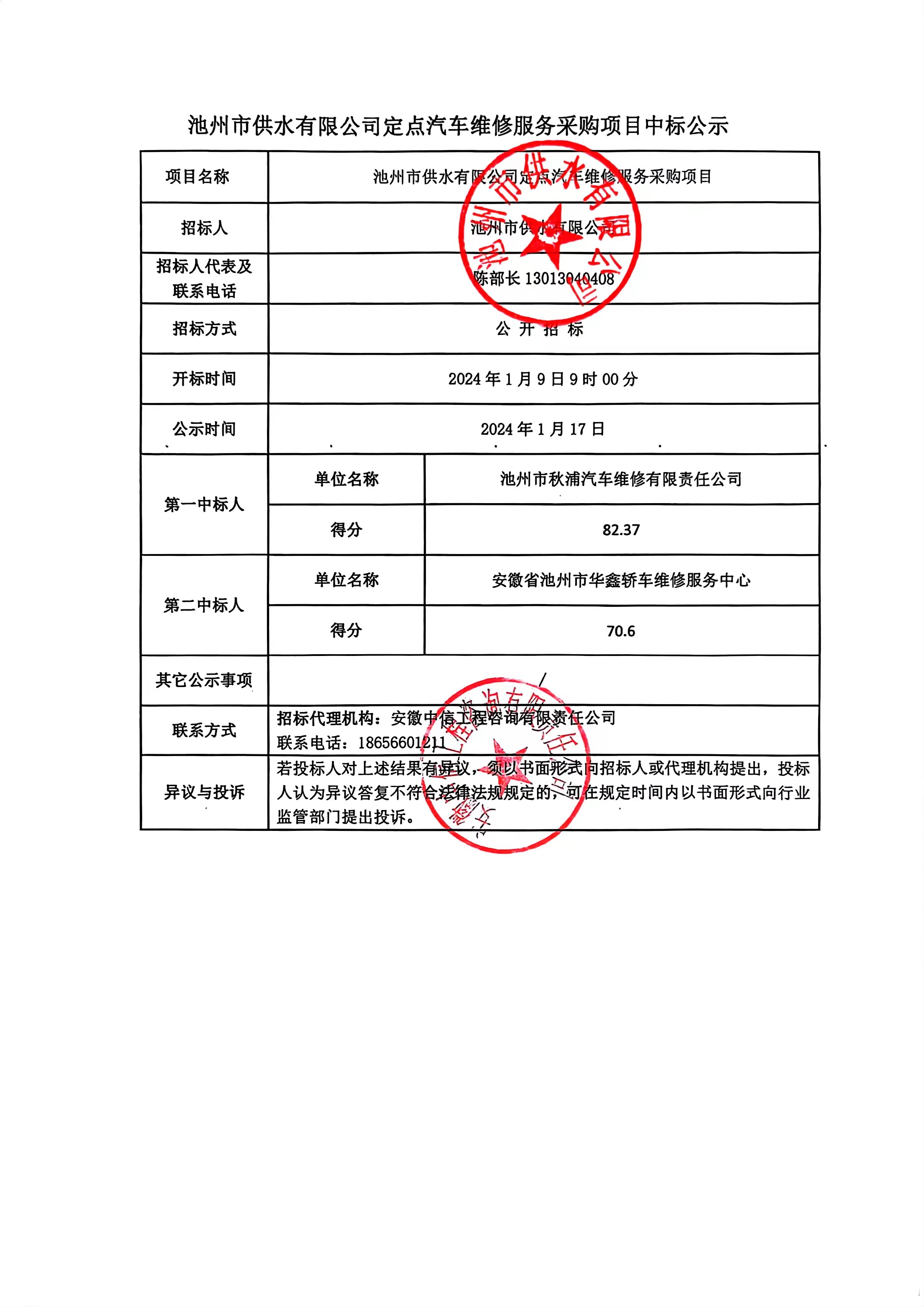 | 池州市供水有限公司定點汽車維修服務采購項目中標公示 | |
