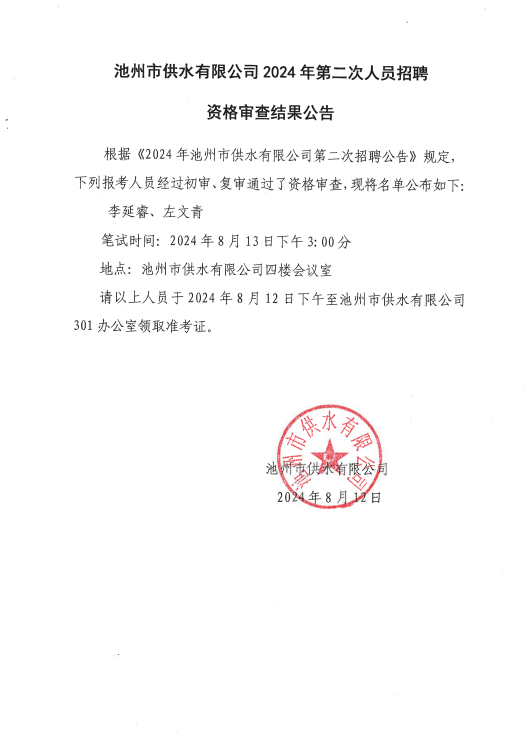 | 池州市供水有限公司2024年第二次招聘資格審查結果公告 | |