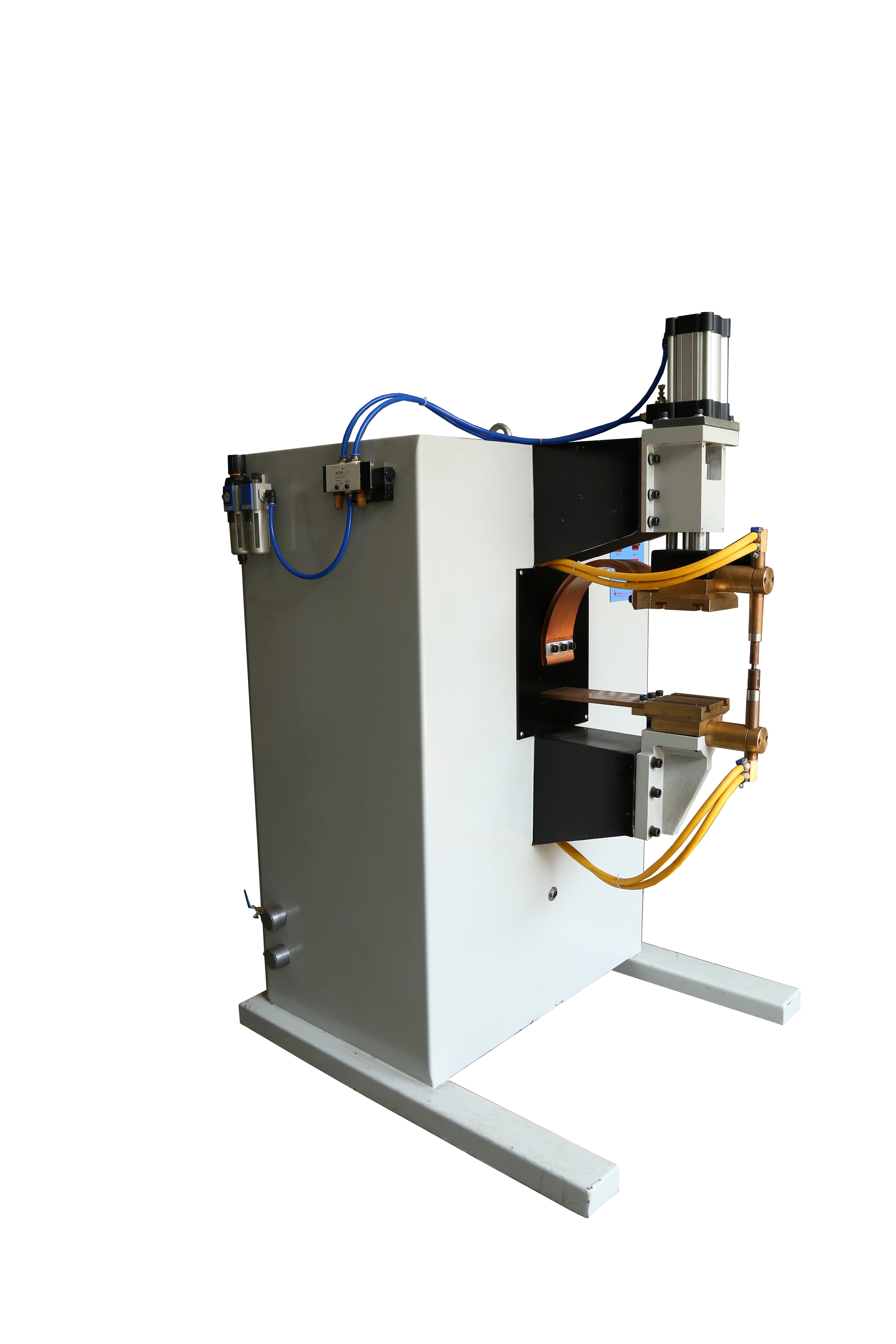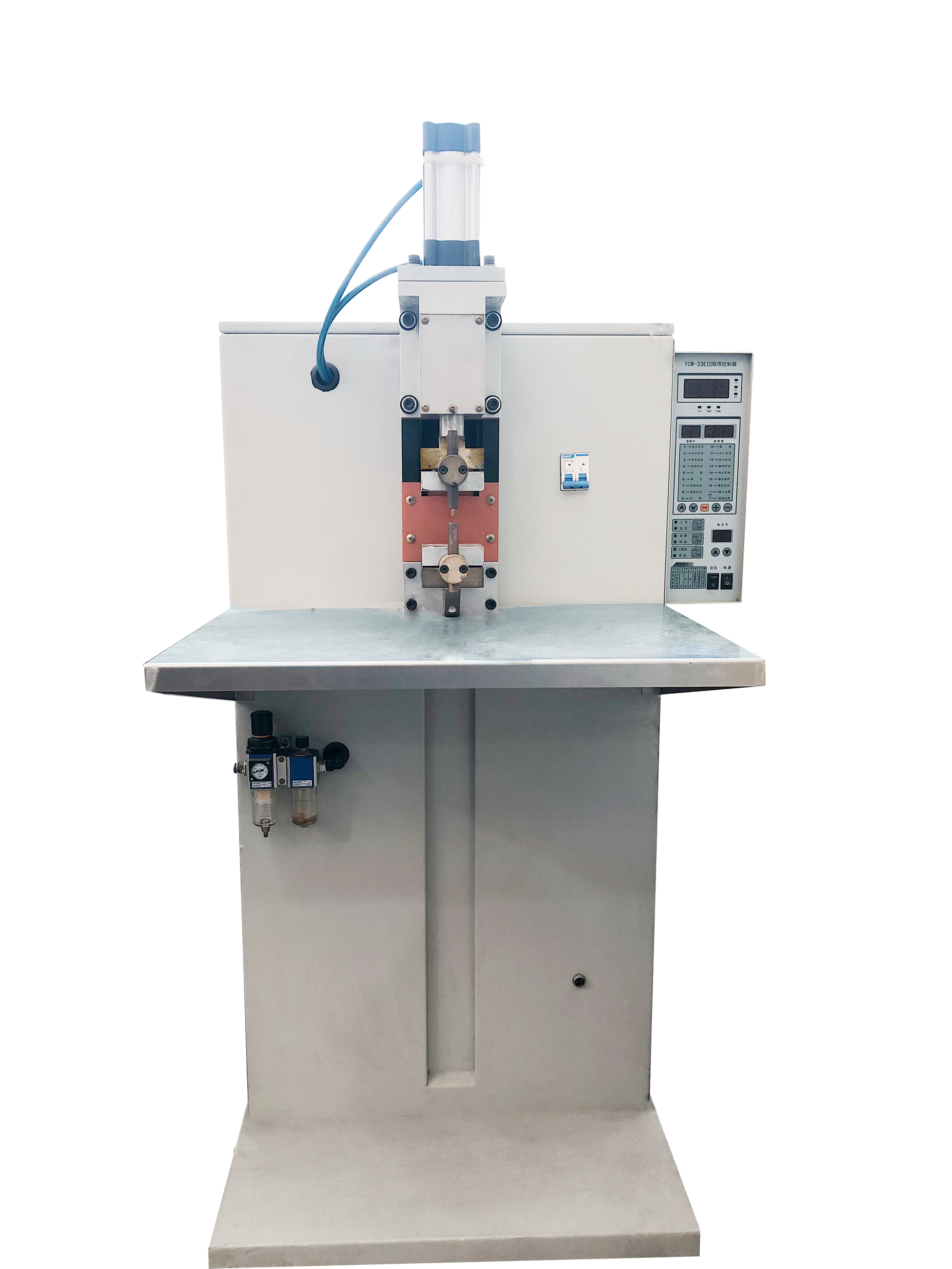 傳動部分采用氣動加壓,能保證足夠的焊接壓力,通過四柱滾珠模架的精確導(dǎo)向確保上下電極的平整度。