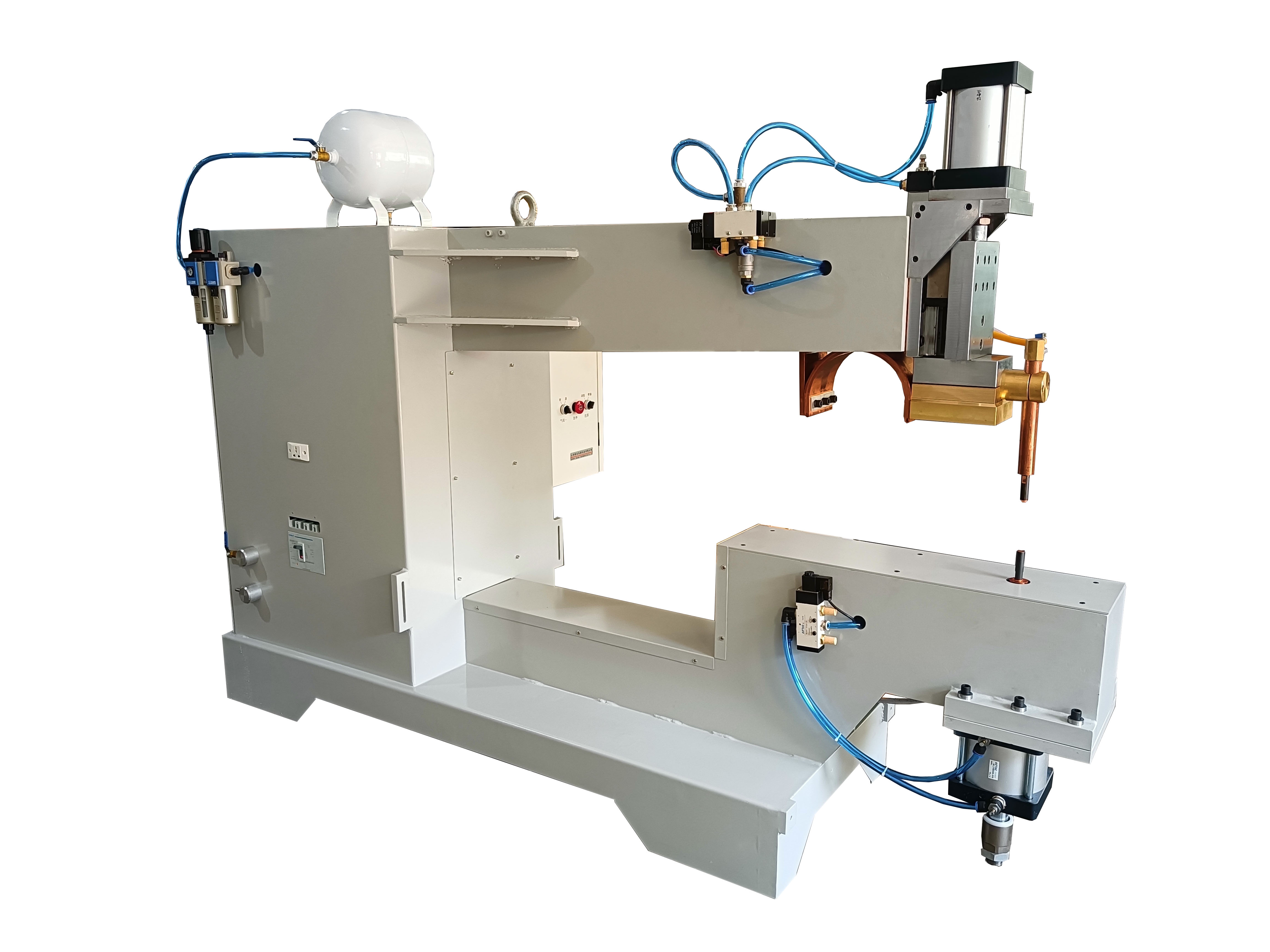 一體式懸掛點(diǎn)焊機(jī)由焊鉗、變壓器、水冷系統(tǒng)、氣動加壓系統(tǒng)、懸掛裝置等部分組成,按照焊臂動作分為兩種,X型鉗和C型鉗。X型一體式懸掛焊機(jī)。