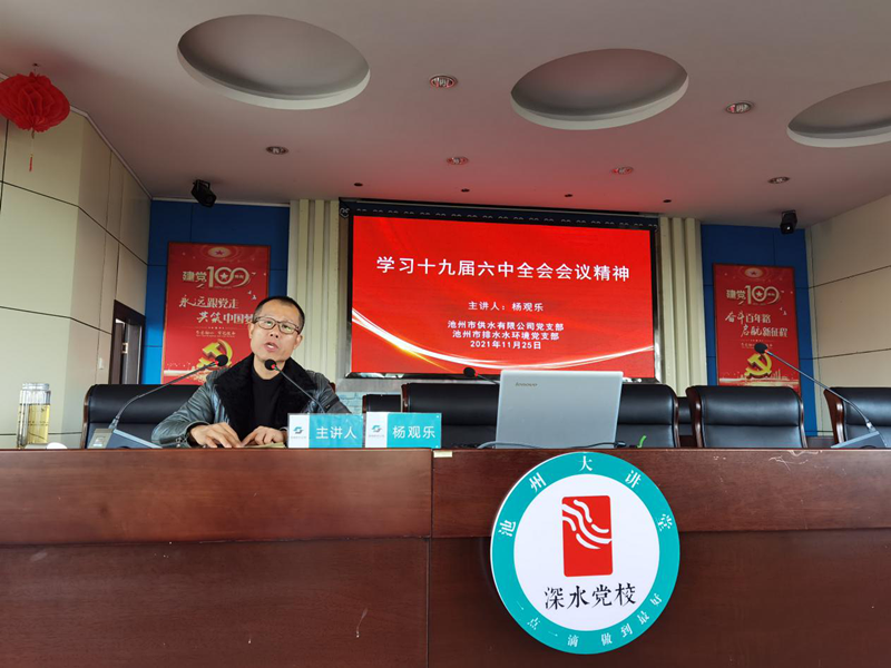 11月25日,池州市供水、排水、水環(huán)境公司黨支部聯(lián)合開展深水黨校·池州大講堂第7期,支部書記楊觀樂(lè)傳達(dá)學(xué)習(xí)黨的十九屆六中全會(huì)精神,宣傳委員施潔上《一樣的初心,不一樣的精彩》專題黨課。