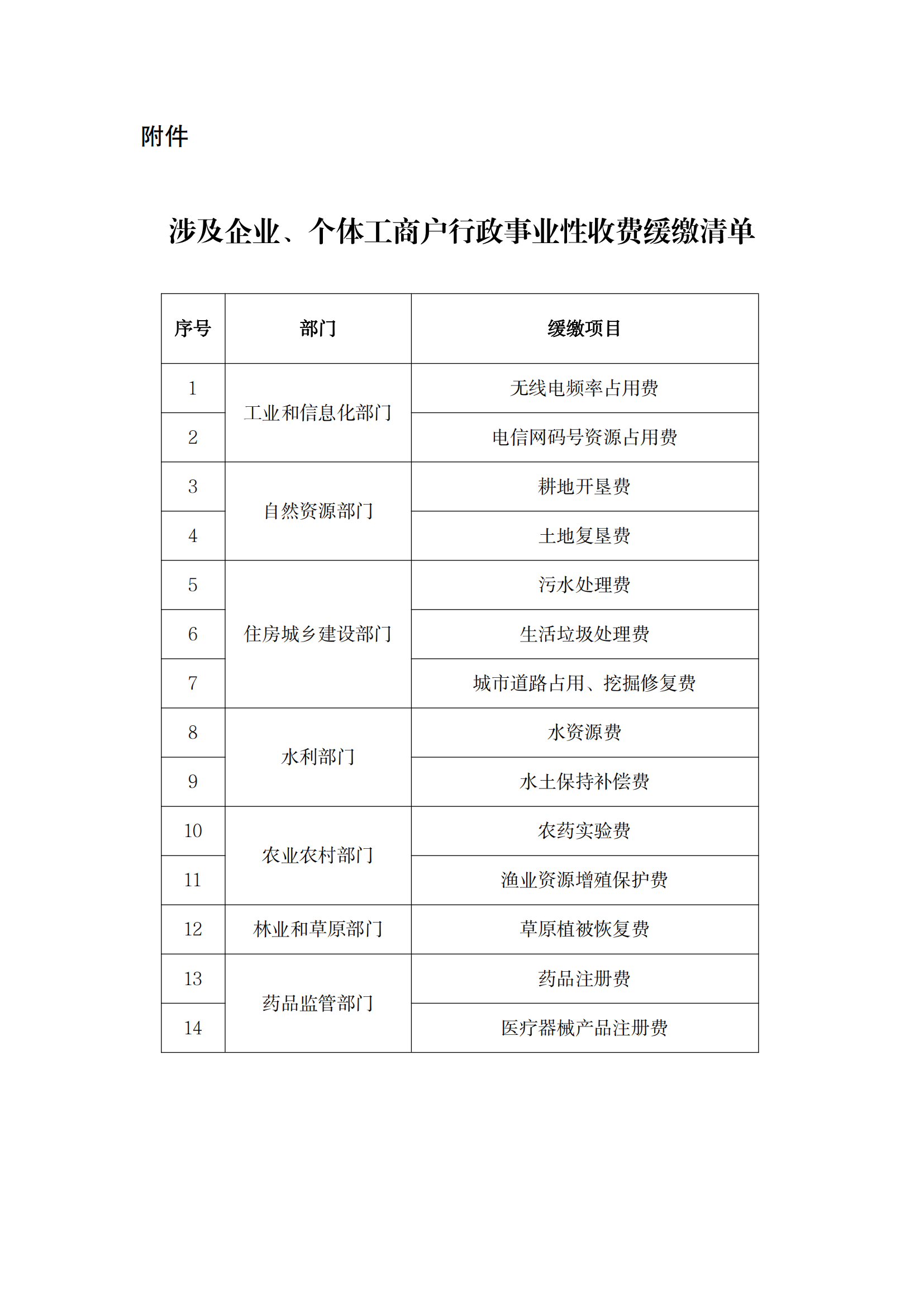 | 關于緩繳涉及企業、個體工商戶部分行政事業性收費的公告 | |