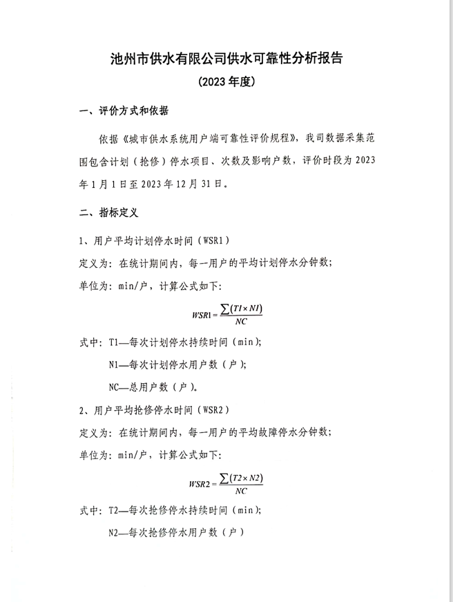 | 池州市供水有限公司供水可靠性分析報告 | |