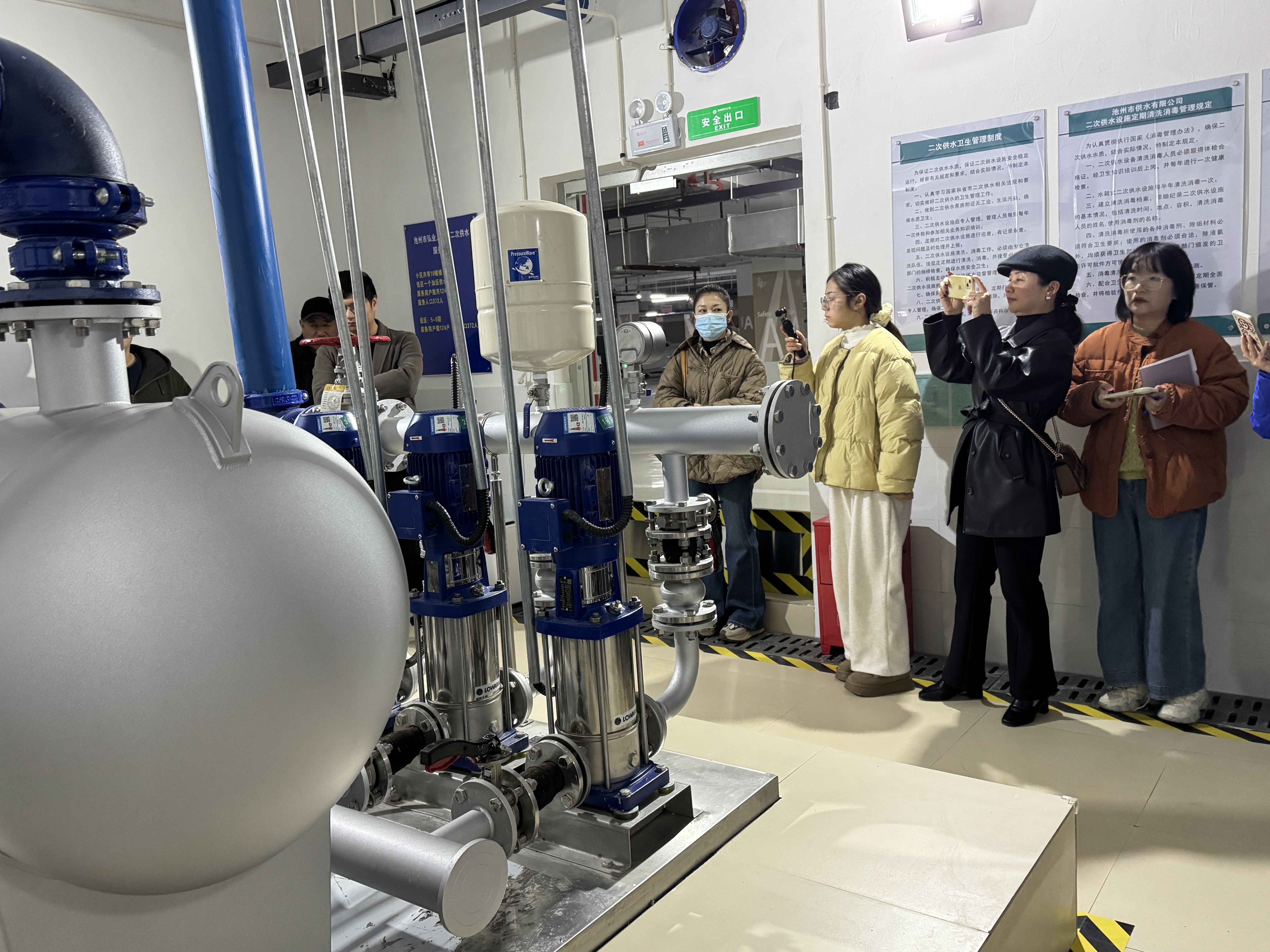 座談會前,用戶代表首先參觀了弘業上河琚小區二次供水泵站。該小區共有10幢樓,泵站設施先進,環境干凈整潔,服務用戶數124戶,服務人口372人。在現場工作人員的講解下,用戶代表對小區內二次供水流程以及供水泵站的設備運轉情況有了更加深入的認識,工作人員還詳細介紹了水廠的出廠水水壓、水質以及自來水與日常生活生產相關的信息,就客戶關心的問題進行一一解答。