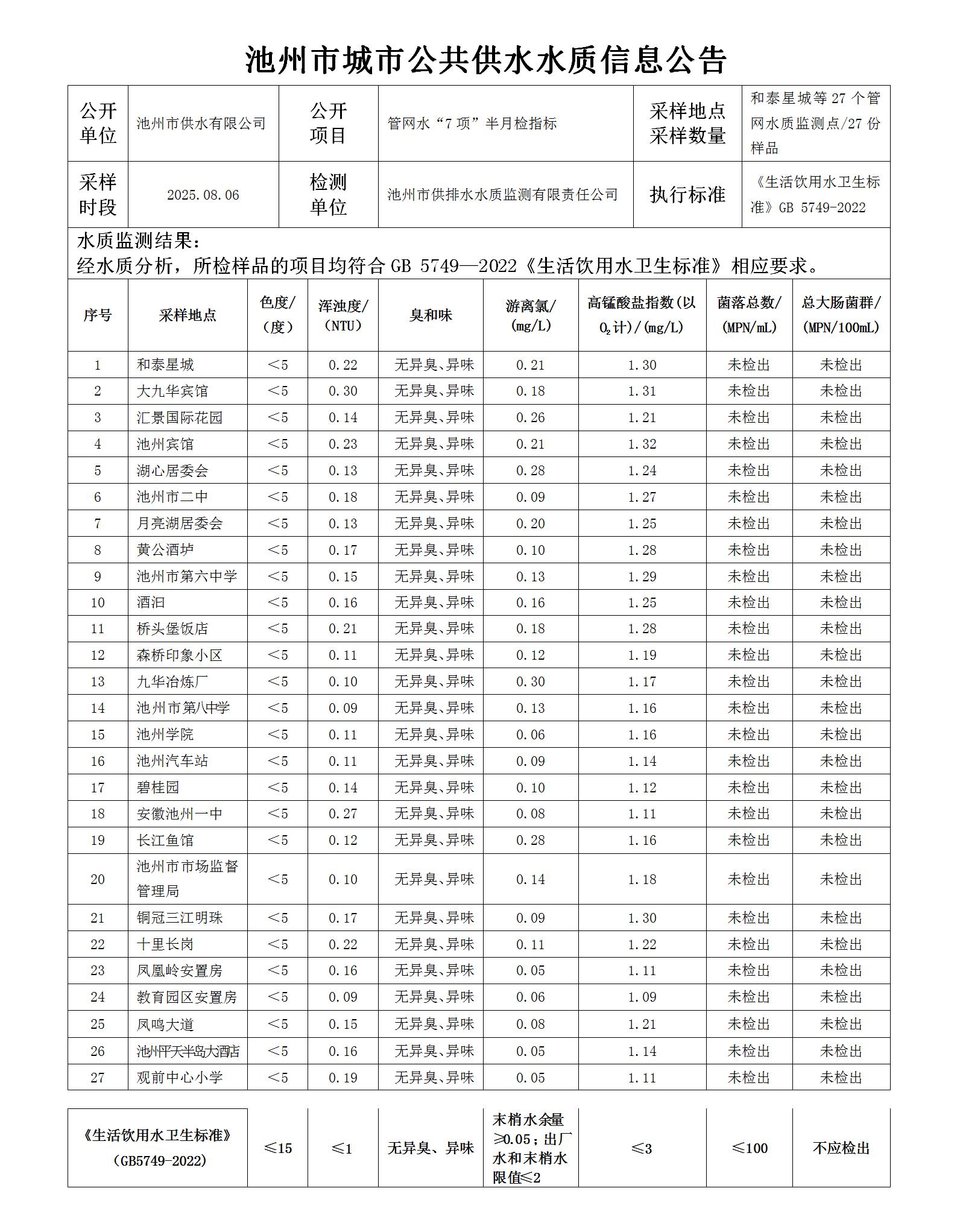 | 池州市城市公共供水水質信息公告管網水“7項”半月檢指標20250806 | |